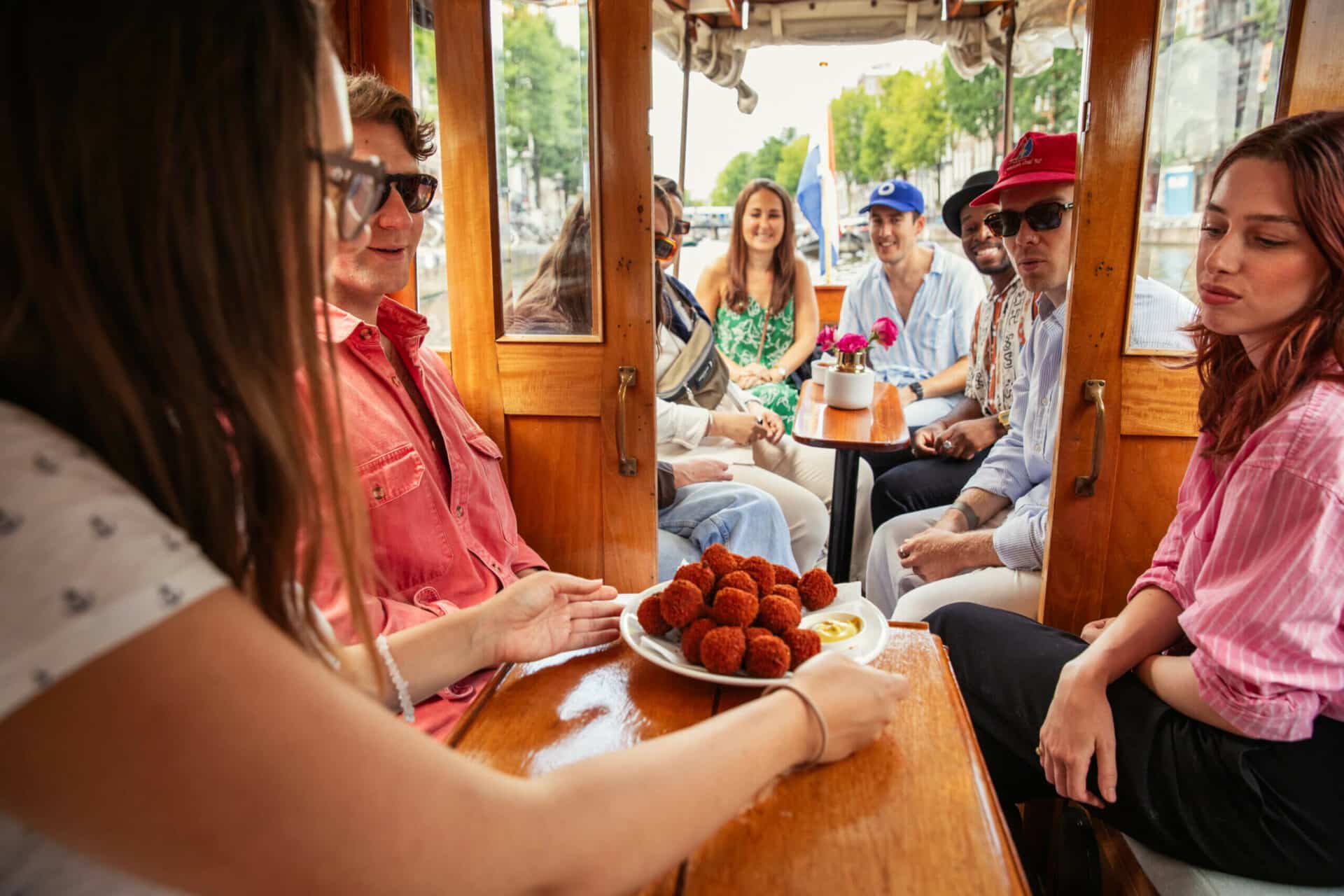 Join our unforgettable Amsterdam food tour, cruising along the iconic canals of the city on a beautifully restored wooden saloon boat.