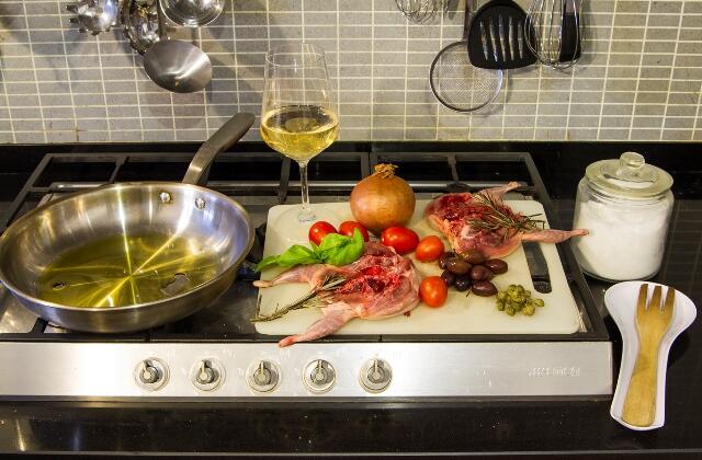 Add basil, olives and capers and then the wine and let it cook off, until you can’t smell the alcohol. Dice the tomatoes and add them to the pot. Add salt and rosemary. Cover and simmer on a reduced heat until sauce comes together and the quail is cooked. You can serve the quail with basmati rice cooked in salted water or simply with crusty bread.